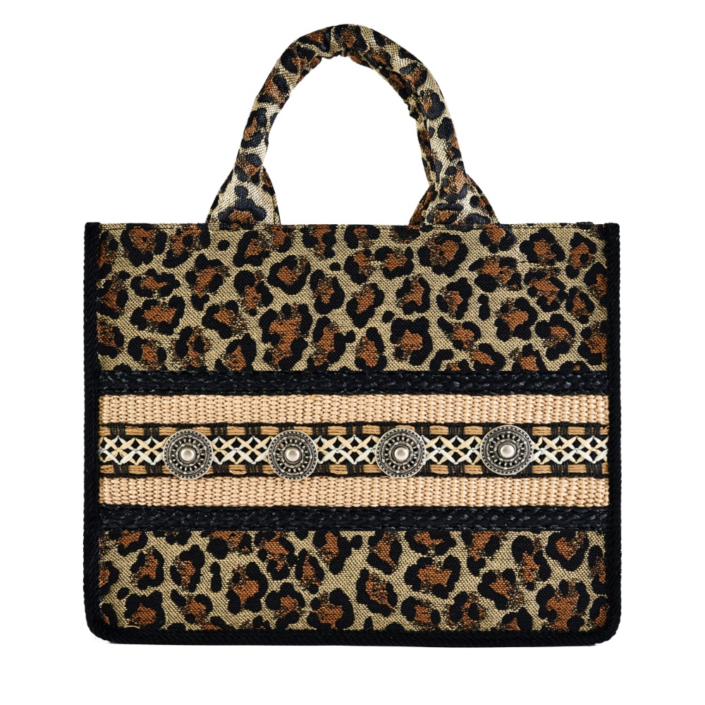 Bolso shopper de rafia jacquard con aplicaciones de pasamanería y tachuelas