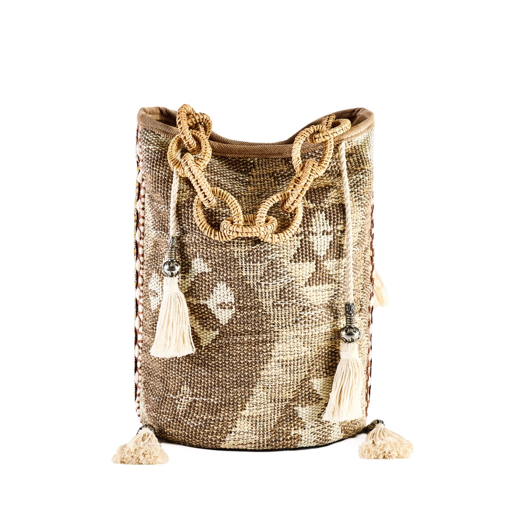 Bolso bombonera en jacquard kilim con pasamanería étnica y borlas