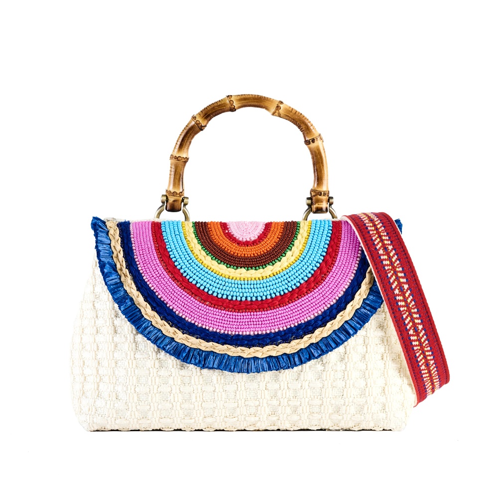 Bolso de rafia estructurado con solapa bordada de pedrería